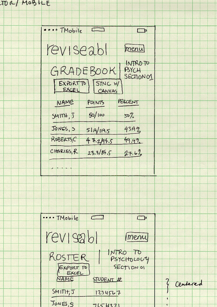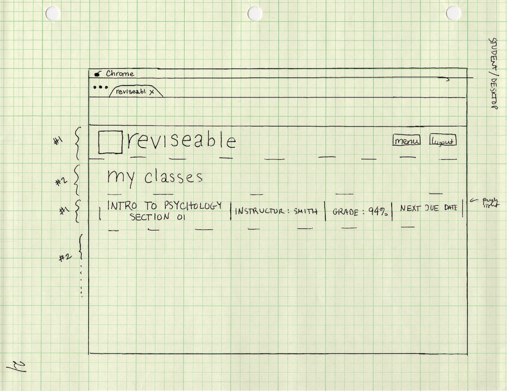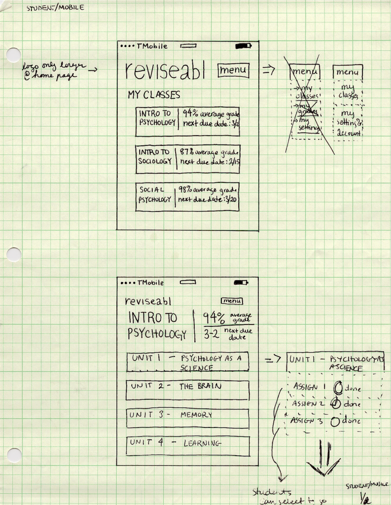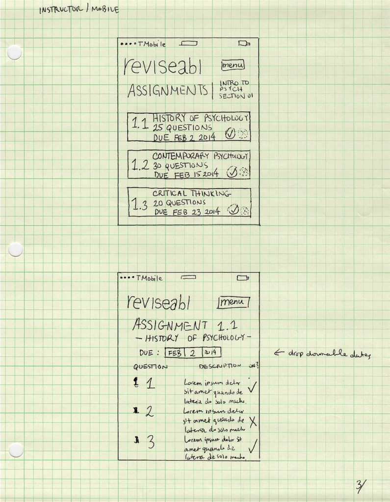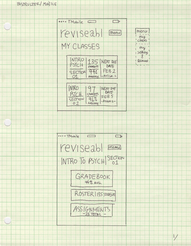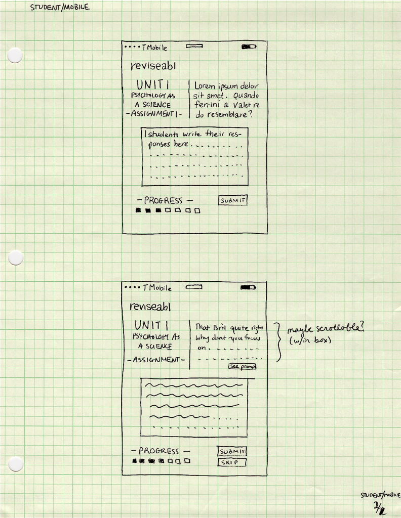 Here, you can see the sketches of the prototype before coding even began. I used these to specify CSS/wireframe schematics for the UX. Fully implemented in Ruby and Perl by our software development team through iterative lean dev practices. Also, two videos—raw footage that was turned into advertisements and demo spots—of me running a local copy of the Reviseabl alpha release showing student and instructor views.